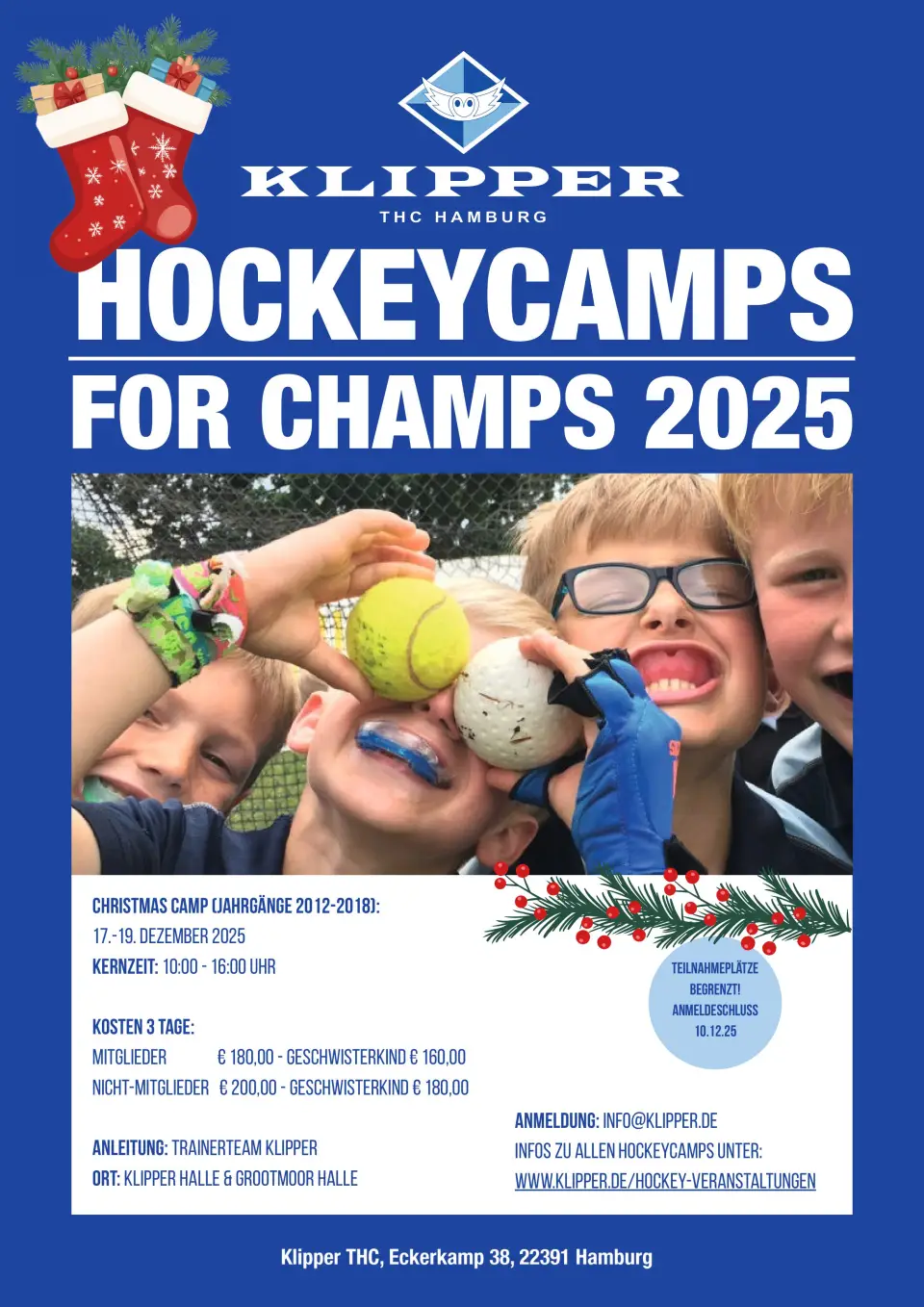 Beim Klipper THC findet vom 17. bis 19.12.2025 von 10:00 bis 16:00 Uhr ein Christmas Hockey-Camp statt. Anmeldeschluss ist der 10.12.2025.