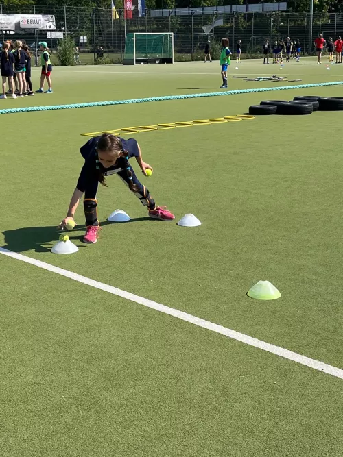 Die Hamburger Landestrainer Nils Leest und Ian Haley leiteten zusammen mit Spieler*innen der Hamburger Auswahl und vom UHC Hamburg die Trainingseinheiten an beiden Tagen. Nach nur kurzer Zeit entwickelten sich viele Anfänger zu Bewegungs- und Ballkünstlern. Eine willkommene Abkühlung unter dem Rasensprenger bei fast 30 Grad ließ sich keines der Kinder entgehen.
