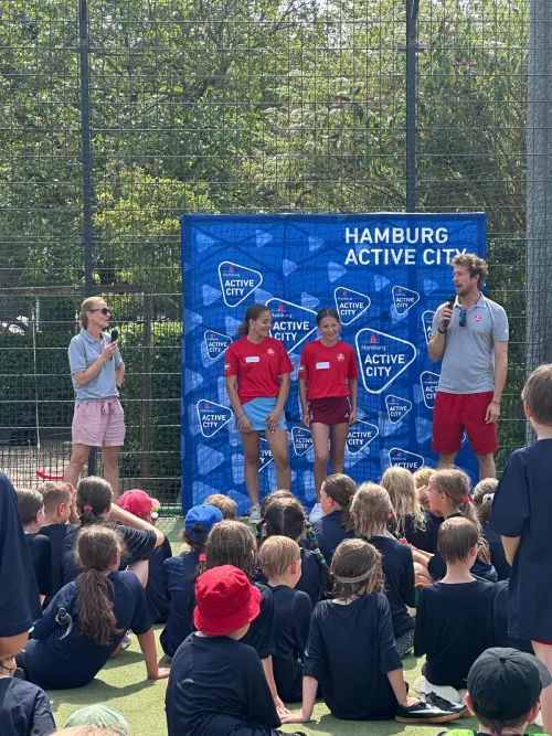 Zum Abschluss der Veranstaltung standen Landestrainer Nils Leest und zwei Spielerinnen den Kindern im Interview Frage und Antwort. Die Spielerinnen erzählten, wie sie zum Hockey gekommen sind, wie viel sie in der Woche trainieren und warum Hockey ihre liebste Sportart ist. Nils Leest gab Einblicke in die Arbeit eines Landestrainers mit den jungen Talenten, wie gesichtet wird und worauf es dabei ankommt.