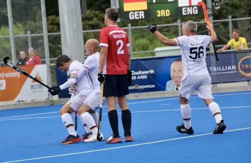 Die deutsche Equipe schlägt Gastgeber Neuseeland im Halbfinale deutlich mit 5:0 und zieht ungeschlagen gegen die spielstarken Australier, die Argentinien hinter sich ließen, ins Finale des World Cups der Masters in Auckland ein. Carsten Eimer (Hanauer THC) und Bastian Lueken (ehemals SC 1880 Frankfurt) reihen sich erneut in die Torschützen ein.